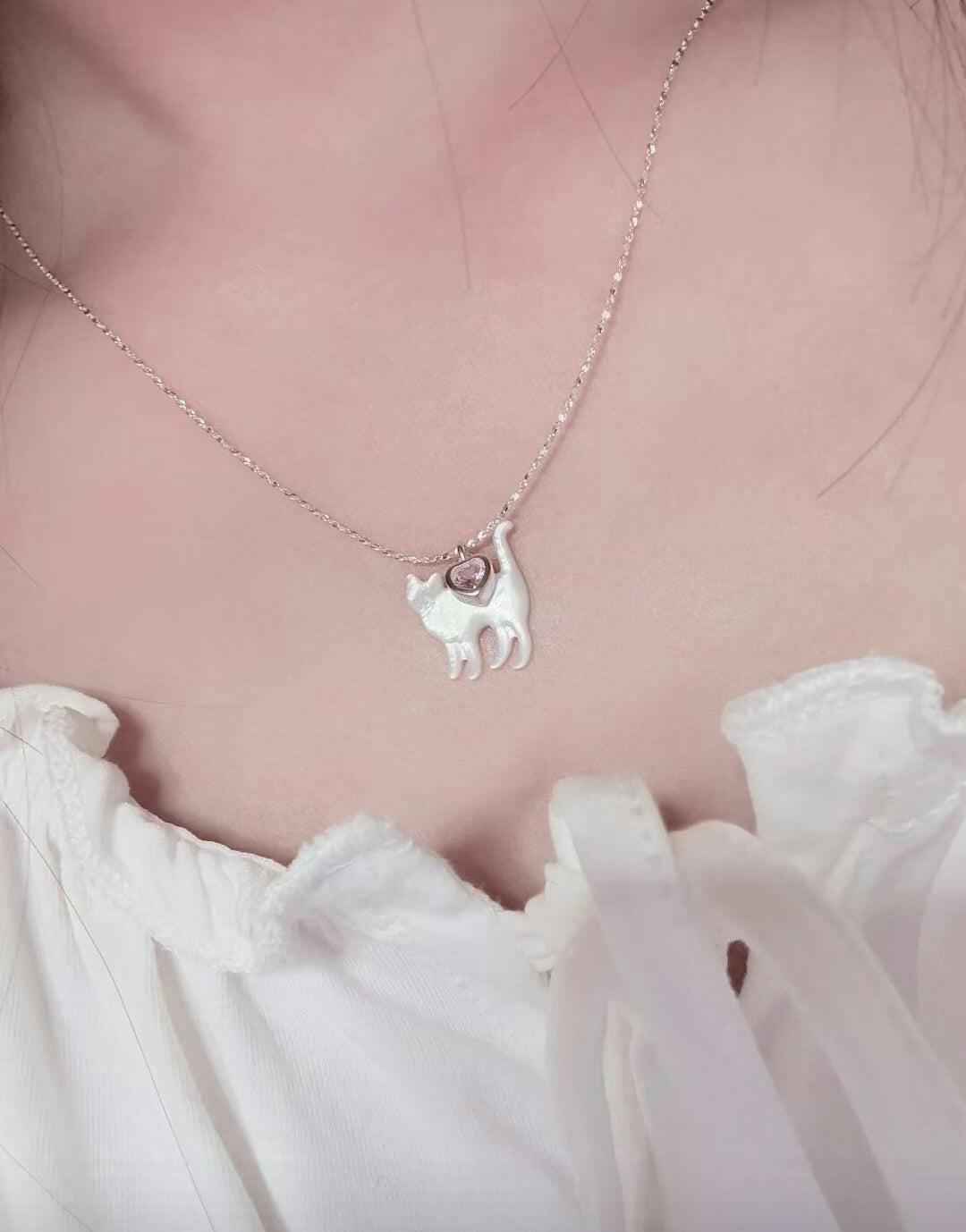 "Be Your Meow" Katzenhalskette aus 925er Sterlingsilber mit rosa Herz-Zirkon und weißem Perlmutt – zart und elegant
