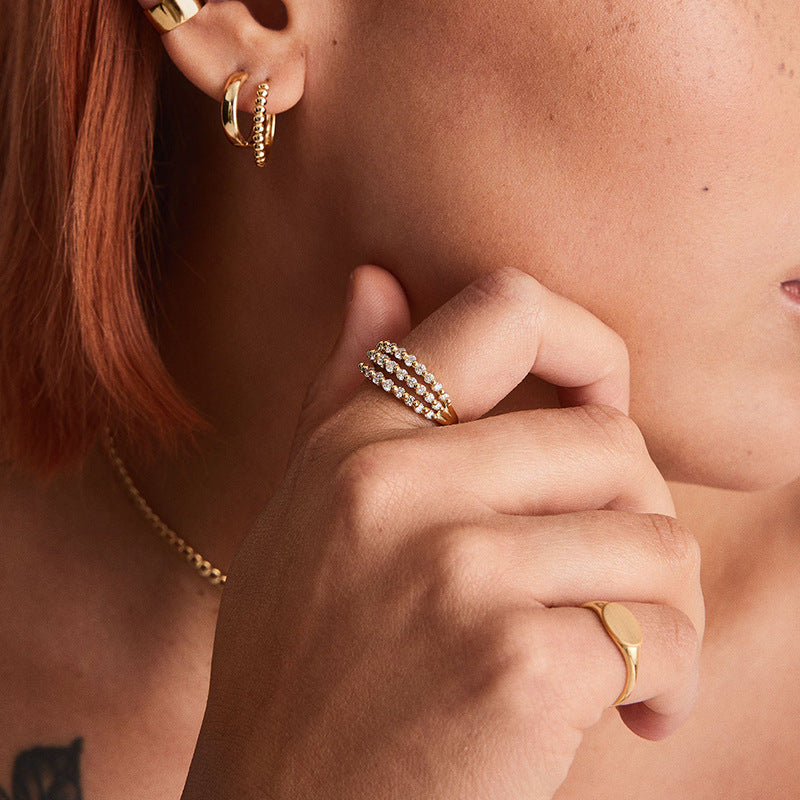 Elevated, modern, and full of radiant sparkle — the “Triple Gleam” ring features three shimmering rows of high-brilliance zircons set in polished 925 sterling silver with rich gold plating. Its layered pavé structure creates a dimensional, high-end look reminiscent of luxury jewelry, while maintaining a lightweight and comfortable fit for...