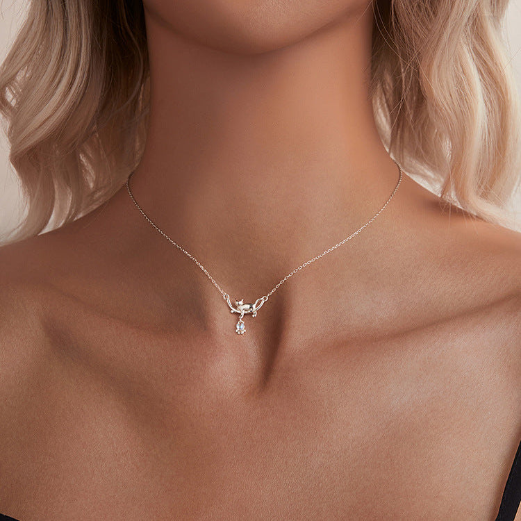 "Moonlight Cat" Platinum-Plated 925 Sterling Silver Cat Necklace with Moonstone – Playful & Elegant